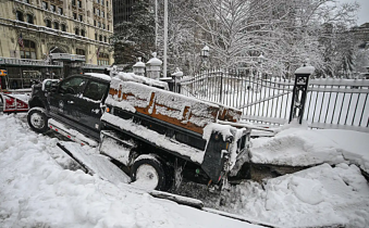 Snowplow plunges into sidewalk sinkhole outside of City Hall…